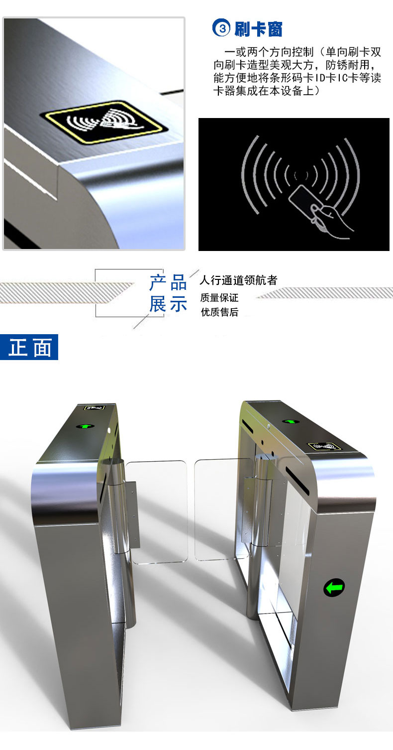 ⊙刷卡后,摆臂打开,提示行人通过,人通过后,摆臂自动关闭。